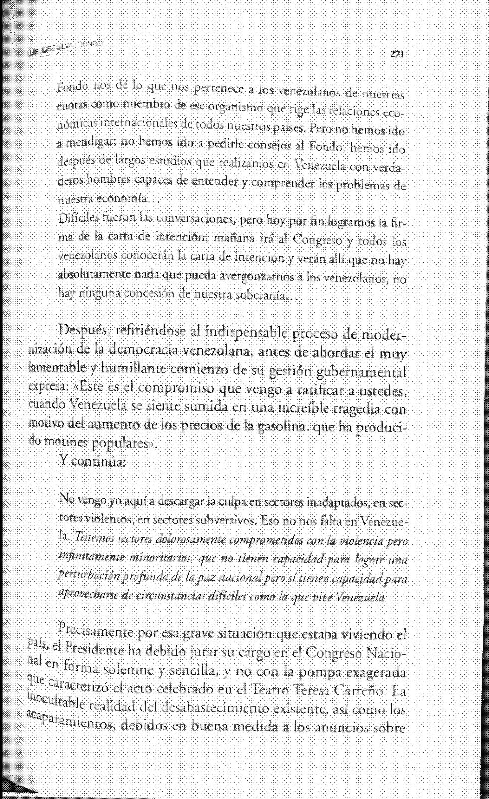 Durante el caracazo la gente no se vengaba de los político; protestaba contra la exclusión del mercado, porque no soportaban el alto costo de la vida, porque los bienes que necesitaban estaban fueran de su alcance. Por eso salió a tomar lo suyo. ¿Acaso no nos dicen que el petróleo es nuestro? ¿Acaso eso no significa que la riqueza es de todo? En febrero de 1989 la energía de la gente se concentró en el pillaje de aparatos eléctricos, comida y whisky, a nadie se le ocurrió atacar Miraflores o la sedes de los partidos. No, el caracazo no fue un acto revolucionario como el que pretenden ahora. Pero quien tiene el poder escribe la historia y ¿Quién no querría contar en su haber con un movimiento de masas tan potentes como lo fue el caracazo?